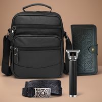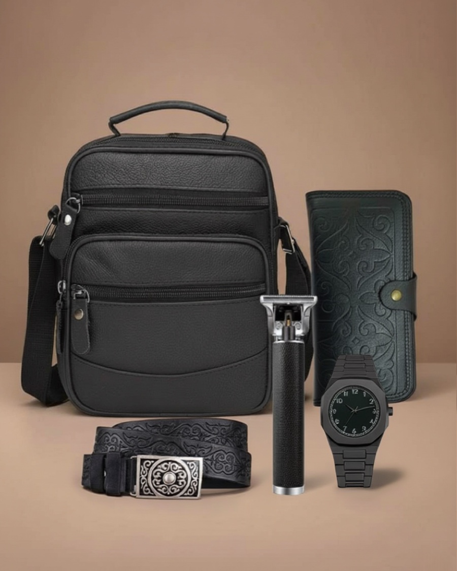 Незаменимые аксессуары: стильная сумка, портмоне – для карт и денег всегда под рукой, кожаный ремень – для комфорта и уверенности в повседневной жизни и триммер.